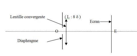 Expérience : Réalisez le montage précédent sur le banc optique et placez un objet à 50 cm devant la lentille de 8 dioptries. Placez l’écran de telle sorte que l’image de l’objet soit nette sur l’écran.