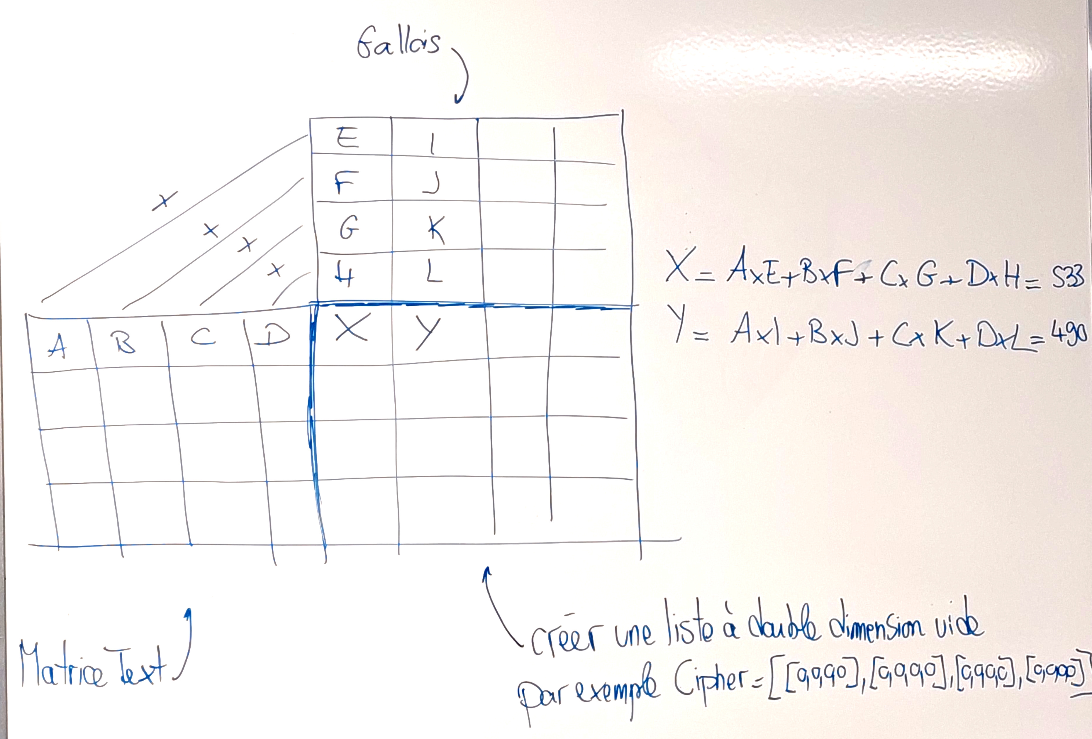 Etape 1 : D’abord à la main : Réaliser la multiplication à la main de la matrice Text et de la matrice de Gallois (que vous trouverez dans la vidéo 2) et vérifier le résultat avec la calculatrice en ligne. Voici la méthode avec les matrices Text et la matrice de Gallois: