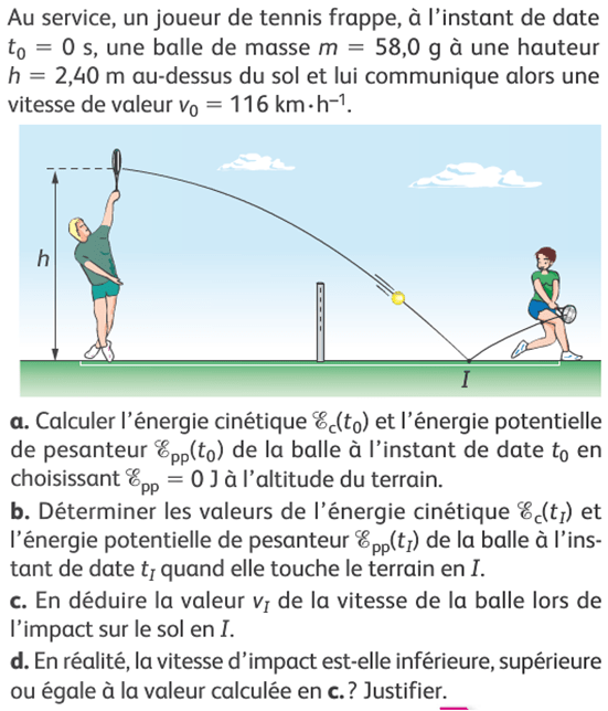 Exercice 2 : a. Ec = 1/2*m*v^2 = 1/2*58*10^-3*(116/3,6)^2 = 30,1. Ainsi Epp = 58*10^-3*2,40*9,81